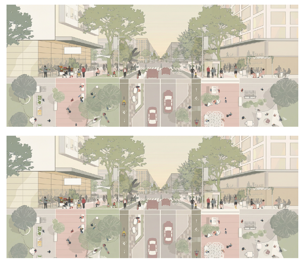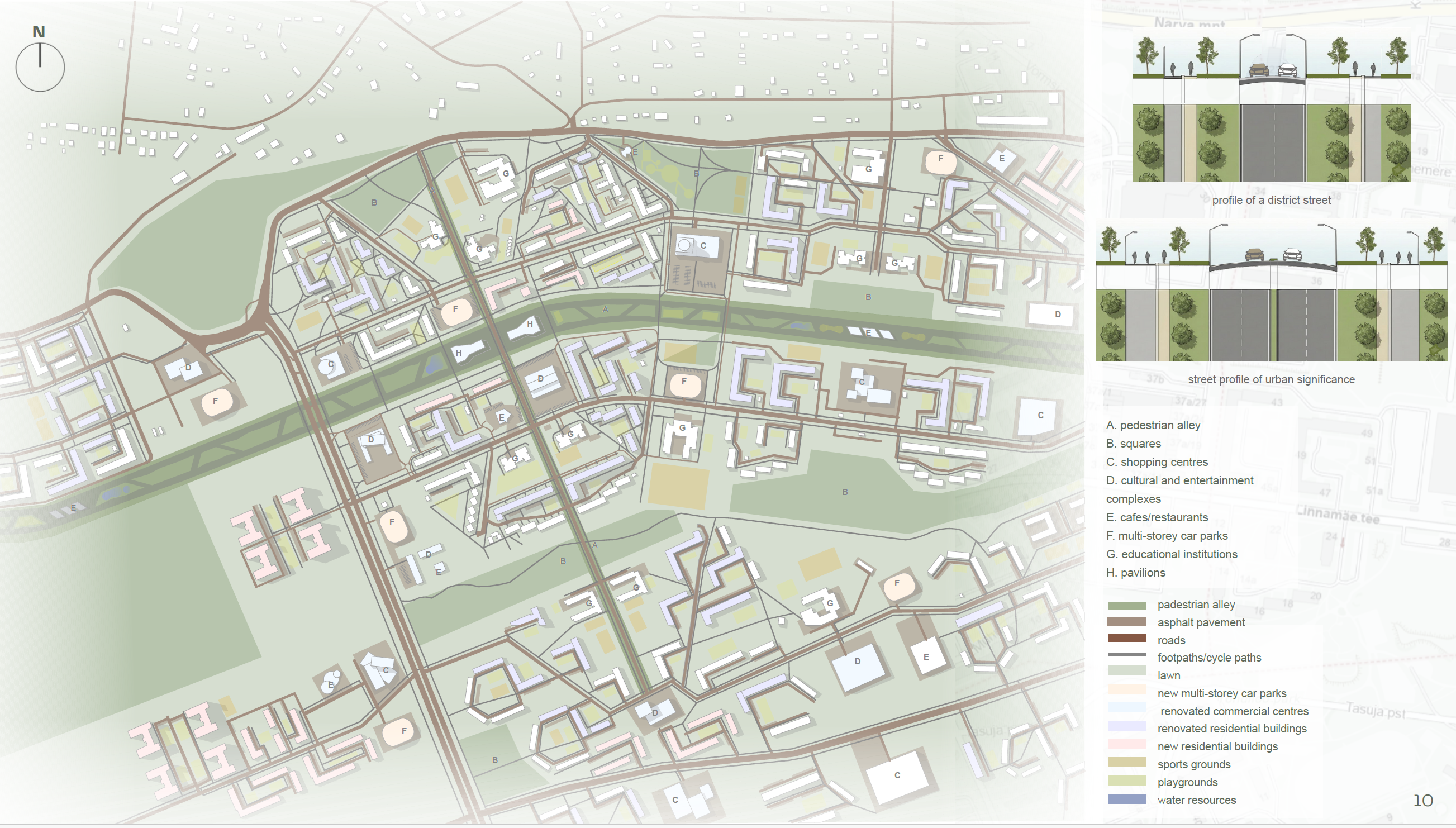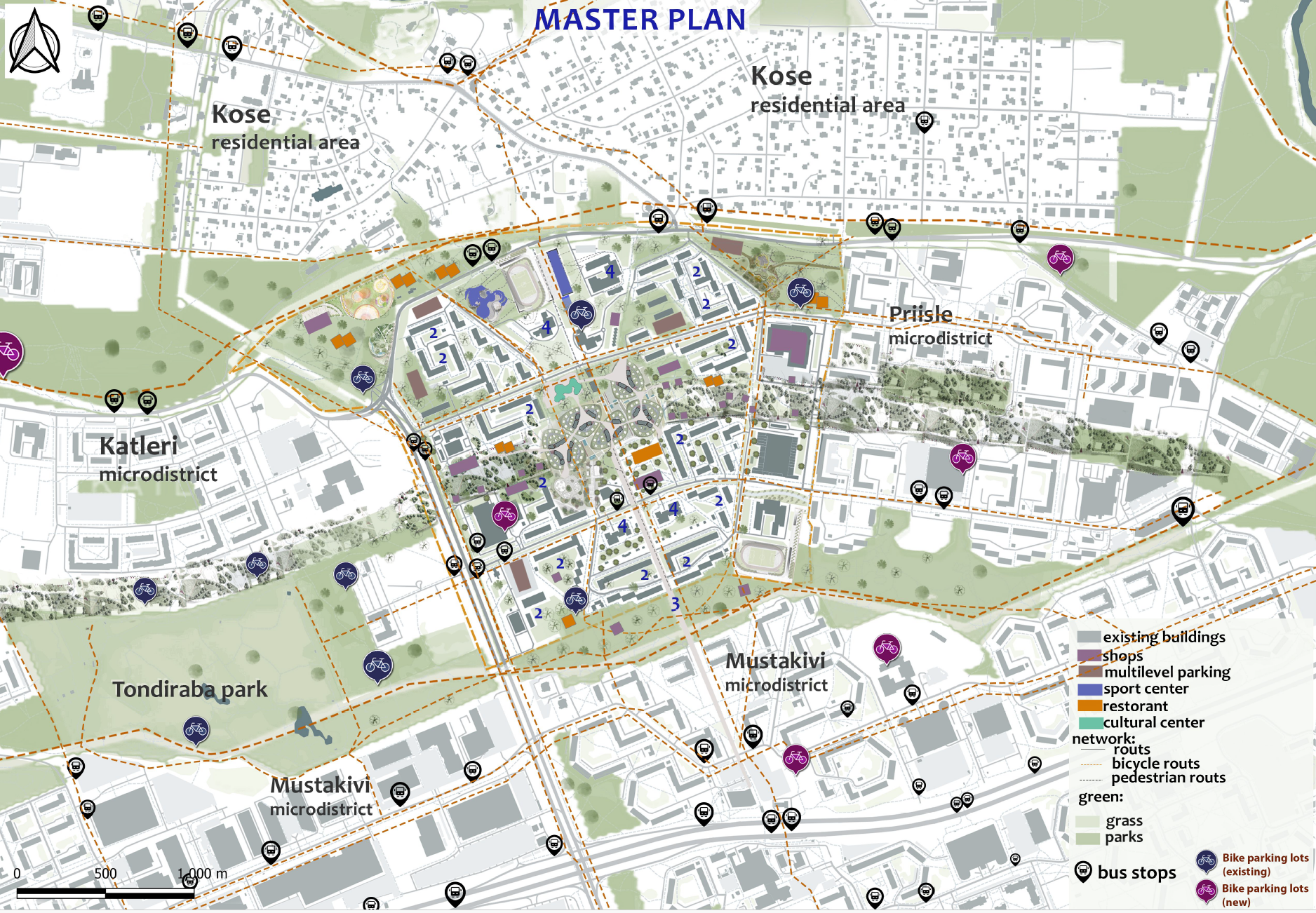The concept restructures the Kuristiku microdistrict by transforming its car-dominated center into a vibrant cultural and public hub. Originally designed as a residential Soviet-era neighborhood with educational infrastructure and green spaces, Kuristiku’s central areas are now dominated by surface parking, fragmenting the district and limiting social interaction. The strategy relocates parking and technical functions to the periphery and introduces a central green corridor enriched with cultural, commercial, and public spaces. This corridor connects residential clusters, schools, and nearby parks via pedestrian and bicycle networks, supporting the 15-minute city principle. New development respects the existing five-to-nine-story building heights, while low-rise cultural facilities activate the center. By integrating green corridors, public spaces, and improved mobility, the concept strengthens neighborhood identity, encourages social interaction, and reconnects Kuristiku with surrounding microdistricts, creating a family-friendly, pedestrian-oriented, and socially cohesive urban environment.