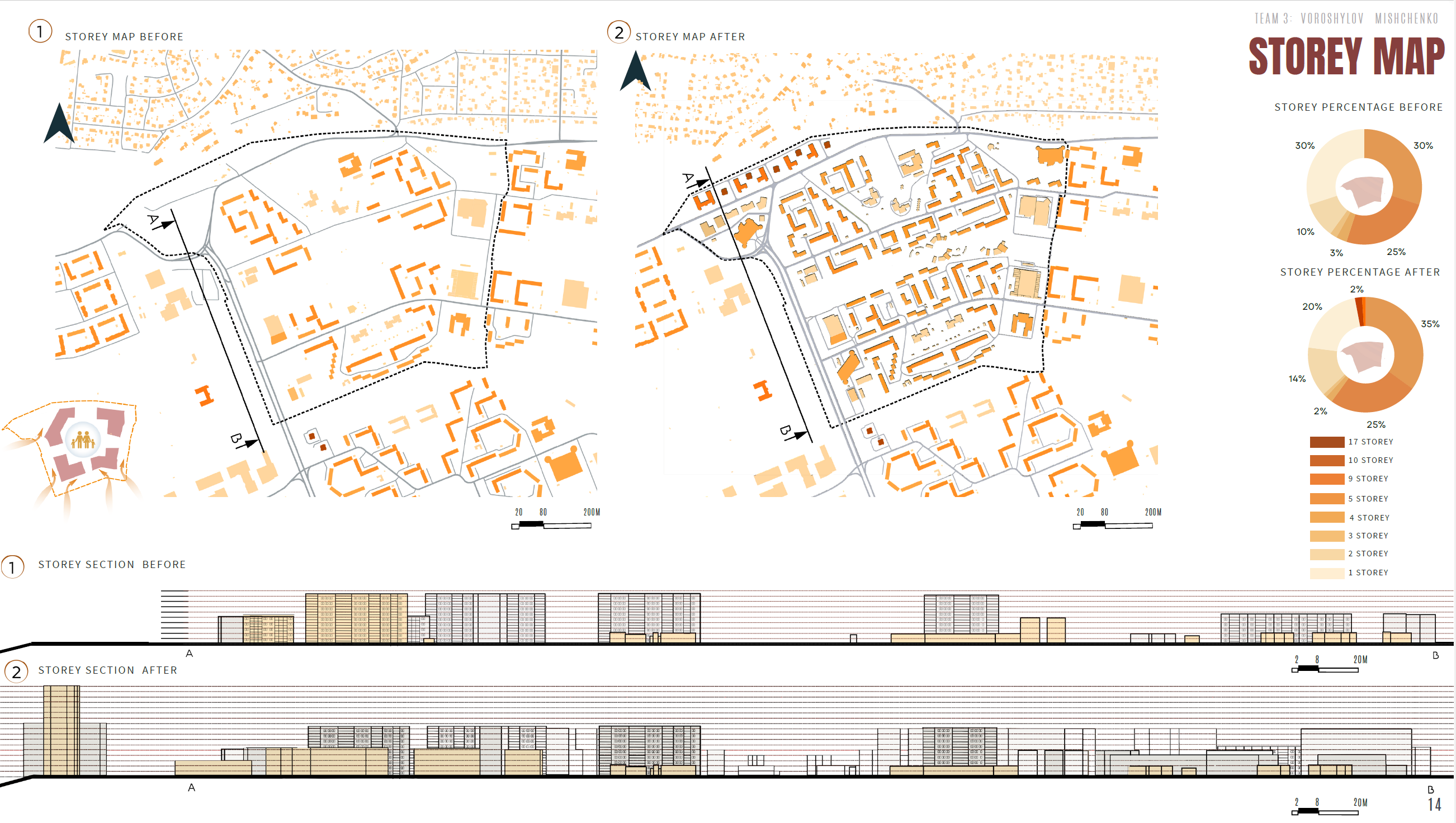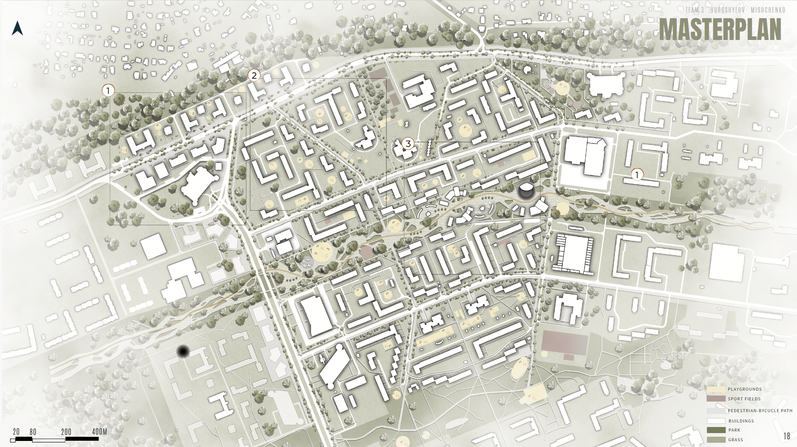 The concept addresses the fragmentation of the Kuristik subdistrict by transforming a car-oriented Soviet-era residential area into a connected, human-scaled urban system. Although the district benefits from generous green courtyards and basic infrastructure, poor internal connectivity, monotonous building morphology, and dominant parking areas limit social interaction and spatial quality. The strategy focuses on creating a continuous Green Corridor supported by a central blue infrastructure element — an artificial river system with dry fountains — linking residential clusters, cultural and educational hubs, and recreational spaces. This corridor becomes the main pedestrian and bicycle backbone, enabling true 15-minute accessibility and reducing car dependency. Selective demolition and low-rise infill development strengthen spatial structure, improve sunlight, and activate public spaces, while landscaped parks, recreational areas, and integrated lighting foster community life and transform Kuristik into a vibrant, legible, socially active urban environment.