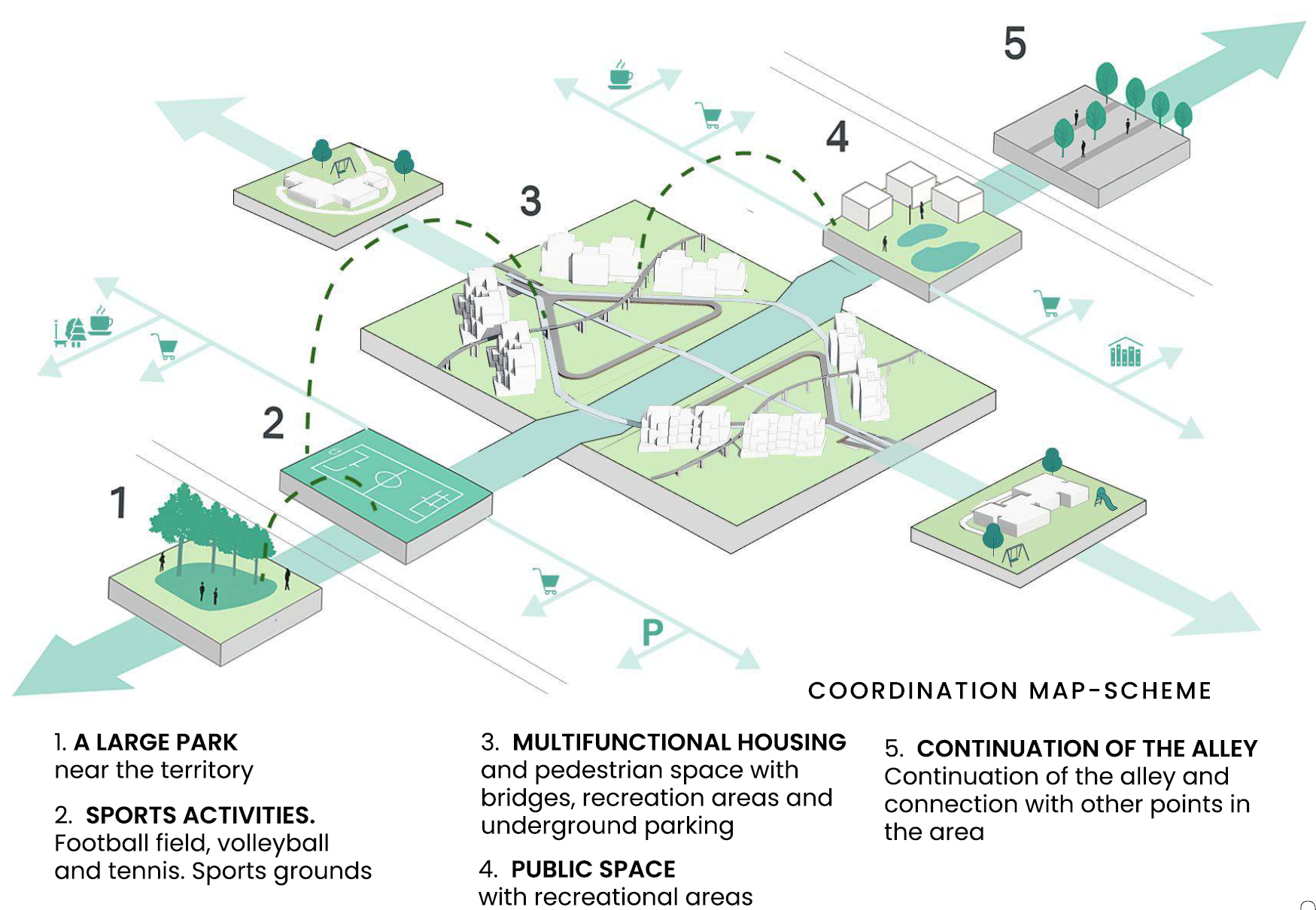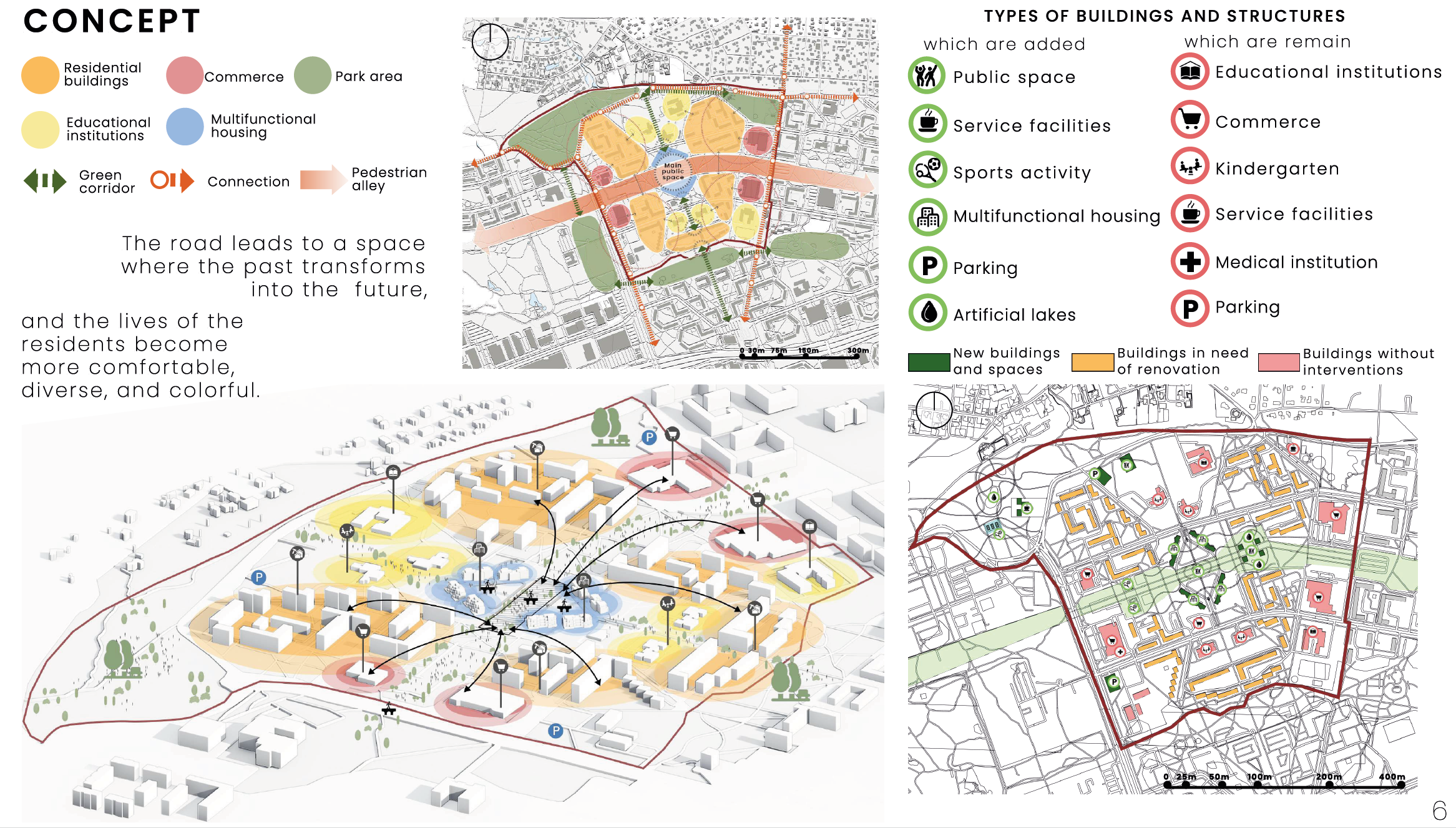 The concept proposes THE CONNECTOR as a continuous pedestrian spine that links fragmented green and recreational areas within the Kuristiku microdistrict. The strategy addresses poor pedestrian connectivity, dispersed open spaces, and microclimatic discomfort by transforming isolated parks and courtyards into a unified green ecosystem. A central alley becomes the backbone for movement, everyday recreation, and social interaction, supporting a 5-minute city model. Mixed-use ground floors, cultural pavilions, and local services activate the route, while multi-storey parking frees courtyards from cars. Landscape design and new building placement improve wind protection and comfort. Together, these interventions transform Kuristiku from a car-oriented “sleeping neighborhood” into an inclusive, walkable, and socially active district with a strong local identity.