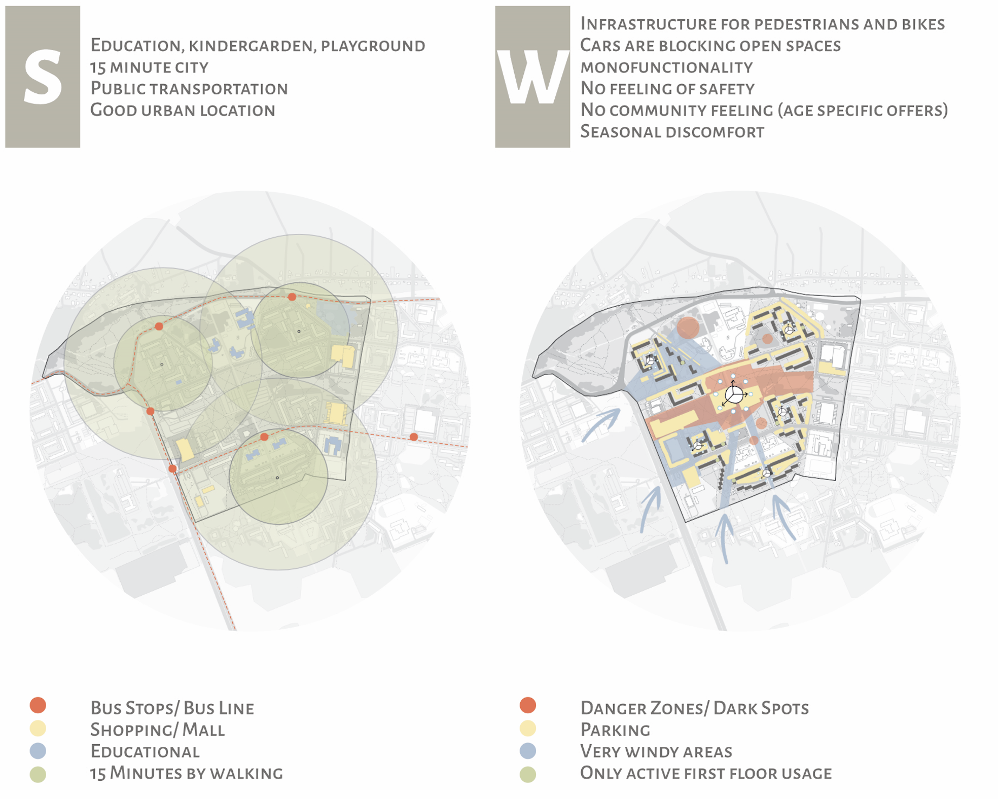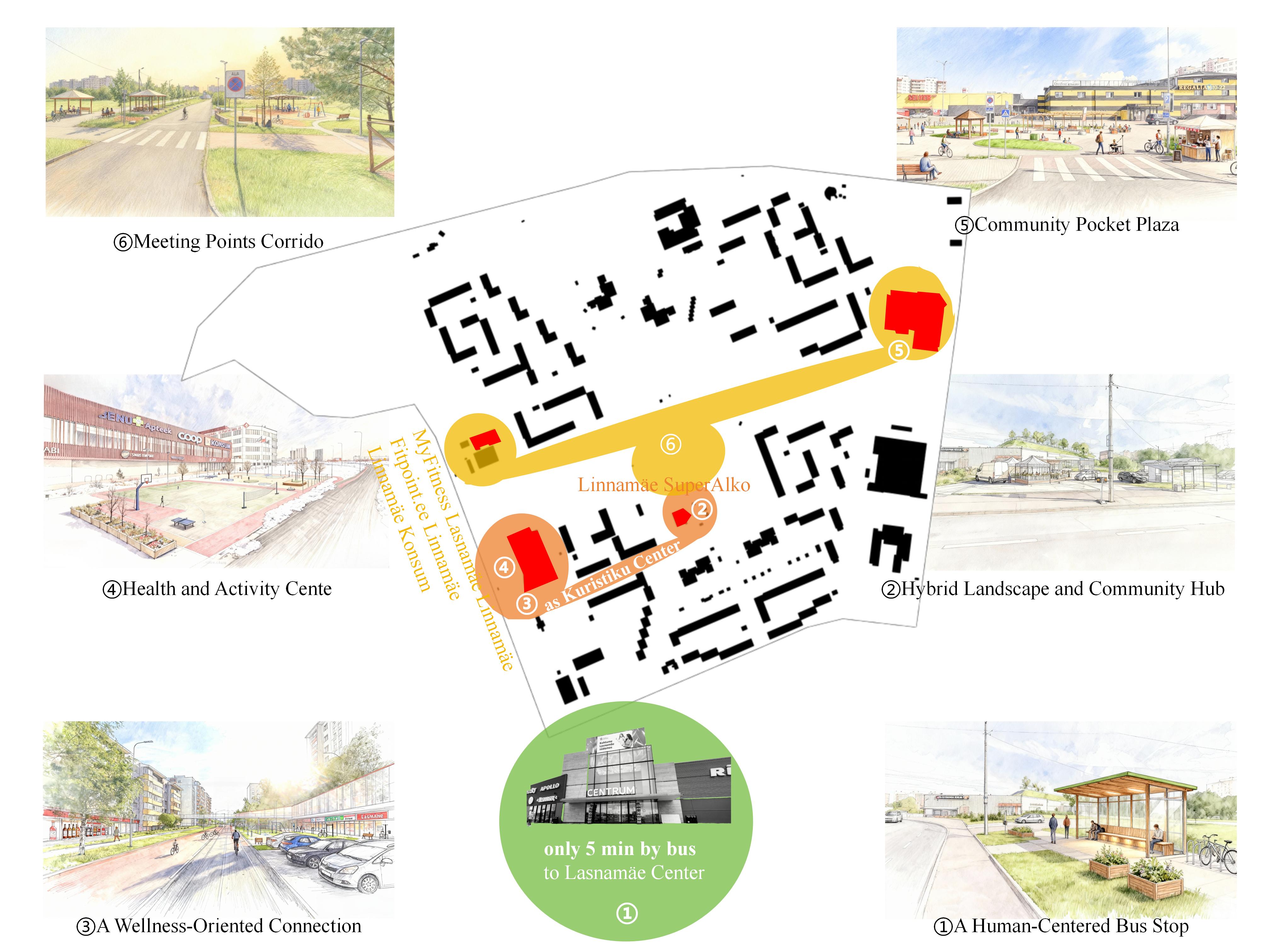 How can resilience be understood not as a response to extreme events, but as the ability of a neighborhood to support everyday life across generations? The concept proposes a strategic redefinition of the Kuristiku central node as a transportation and everyday-life hub. Rather than duplicating nearby large commercial centers, the node is envisioned as a multi-functional cluster combining daily retail, cafés, community services, and improved public transport connections. A hierarchical shopping network is introduced, linking primary and secondary nodes through walkable paths and functional synergy, while also integrating health, activity, and social spaces.