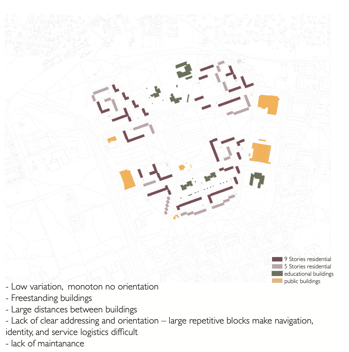“Unfolding the Microrayon Vision” critically revisits the Soviet microrayon concept and master plan as applied to Lasnamäe in Tallinn, Estonia. Our analysis is structured around the original Soviet vision, the current condition, and the resulting goals and initial design concepts. Central to the investigation are the anonymity of the housing blocks and the lack of orientation caused by a mono-functional planning logic, which have led to a lack of addressability and identity. Our aim is to transform anonymous blocks into recognizable neighborhoods. Additionally, the original car-free interior concept has been undermined over time, as vehicles have occupied open spaces in the absence of a clear parking strategy. Our concept proposes assigning distinct identities to individual blocks through varied programs, densities, and spatial qualities.