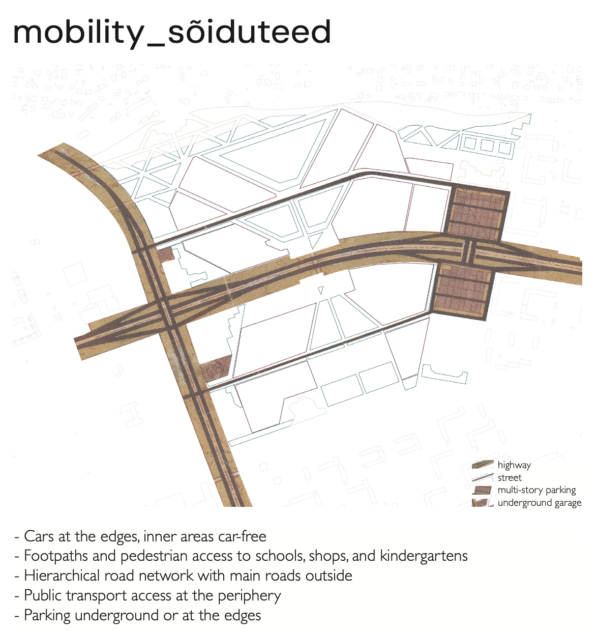 The concept focuses on the re-scaling of Kuristiku as a strategy to enhance urban resilience. By introducing scale transitions from the district level to the neighborhood level and down to the human scale, we aim to create environments that are more legible, flexible, and adaptable over time. Breaking up monolithic land-use patterns and introducing mixed-use functions increase programmatic diversity and economic robustness, while age-inclusive and year-round public spaces strengthen social resilience. In addition, the project emphasizes the activation of ground floors, improved pedestrian and cycling networks, and the clear definition and programming of open spaces. Strengthening existing green structures and integrating ecological functions support environmental resilience and improve microclimatic conditions. Together, these spatial strategies form a coherent framework for transforming Kuristiku into a more human-centered, socially diverse, and resilient urban district.
