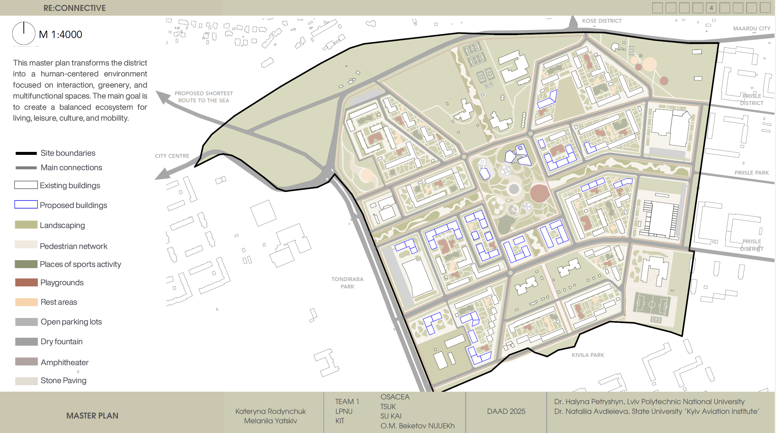 The concept addresses the fragmentation of the Kuristik subdistrict by transforming a car-oriented Soviet-era residential area into a connected, human-scaled urban system. Although the district benefits from generous green courtyards and basic infrastructure, poor internal connectivity, monotonous building morphology, and dominant parking areas limit social interaction and spatial quality. The strategy focuses on creating a continuous Green Corridor supported by a central blue infrastructure element — an artificial river system with dry fountains — linking residential clusters, cultural and educational hubs, and recreational spaces. This corridor becomes the main pedestrian and bicycle backbone, enabling true 15-minute accessibility and reducing car dependency. Selective demolition and low-rise infill development strengthen spatial structure, improve sunlight, and activate public spaces, while landscaped parks, recreational areas, and integrated lighting foster community life and transform Kuristik into a vibrant, legible, socially active urban environment.