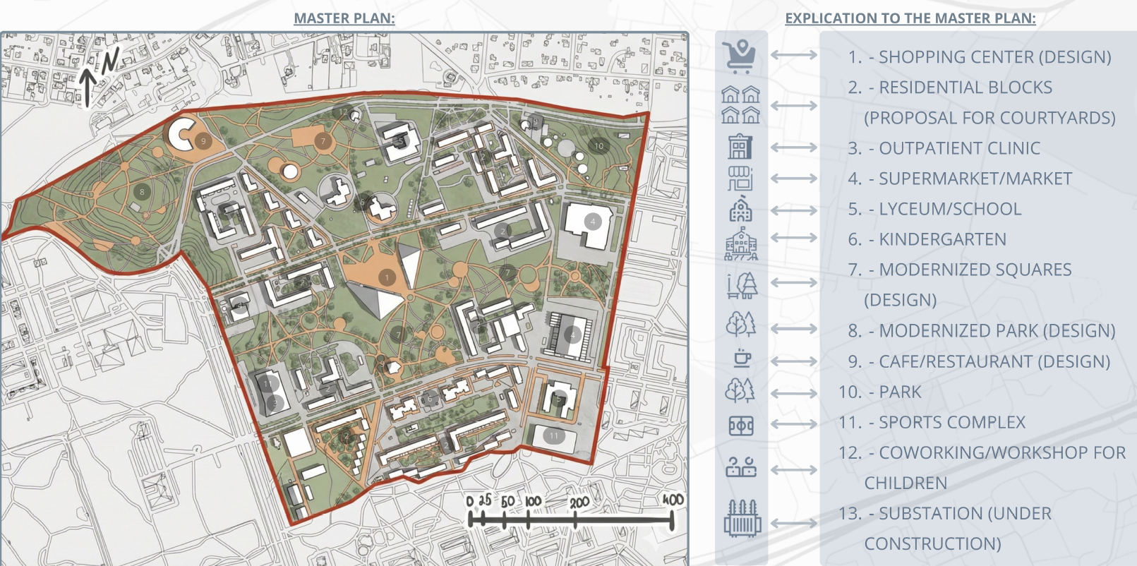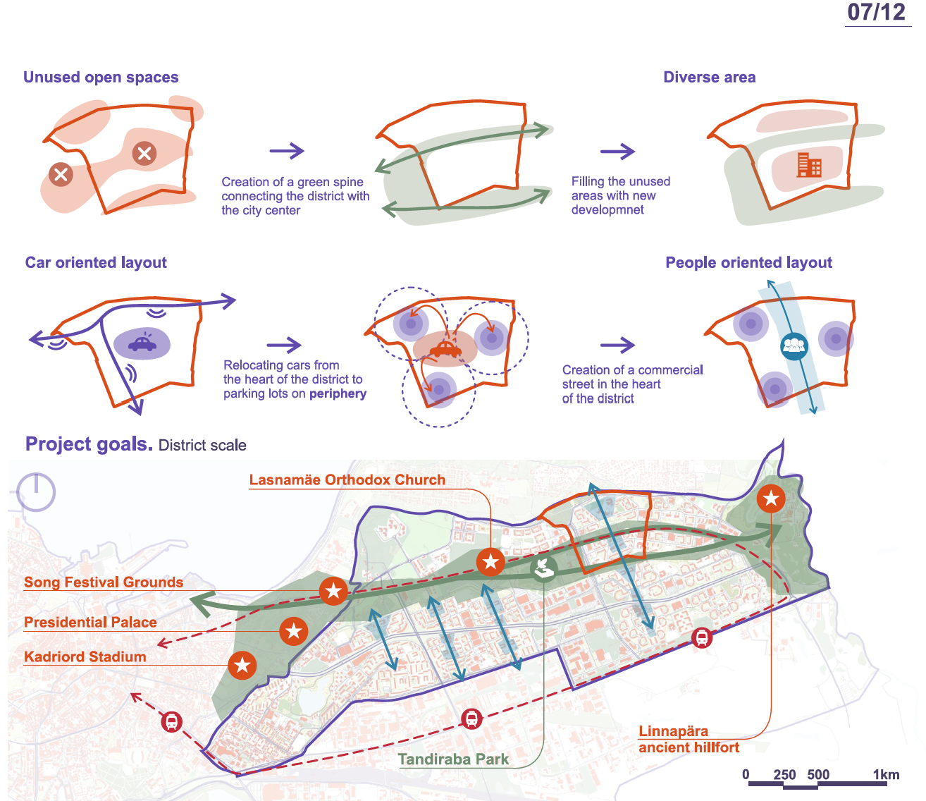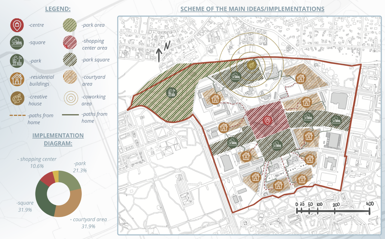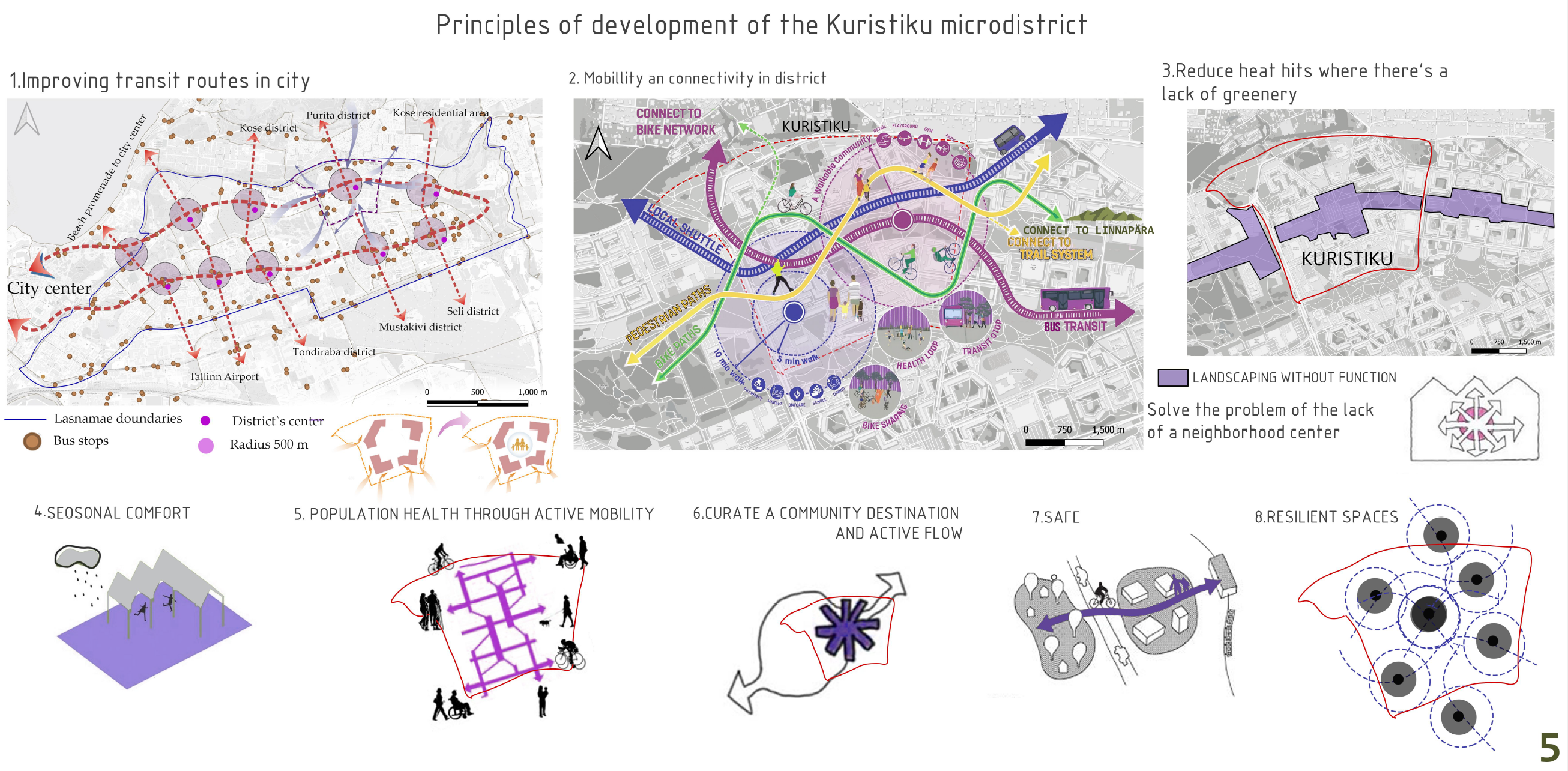 The concept restructures the Kuristiku microdistrict by transforming its car-dominated center into a vibrant cultural and public hub. Originally designed as a residential Soviet-era neighborhood with educational infrastructure and green spaces, Kuristiku’s central areas are now dominated by surface parking, fragmenting the district and limiting social interaction. The strategy relocates parking and technical functions to the periphery and introduces a central green corridor enriched with cultural, commercial, and public spaces. This corridor connects residential clusters, schools, and nearby parks via pedestrian and bicycle networks, supporting the 15-minute city principle. New development respects the existing five-to-nine-story building heights, while low-rise cultural facilities activate the center. By integrating green corridors, public spaces, and improved mobility, the concept strengthens neighborhood identity, encourages social interaction, and reconnects Kuristiku with surrounding microdistricts, creating a family-friendly, pedestrian-oriented, and socially cohesive urban environment.