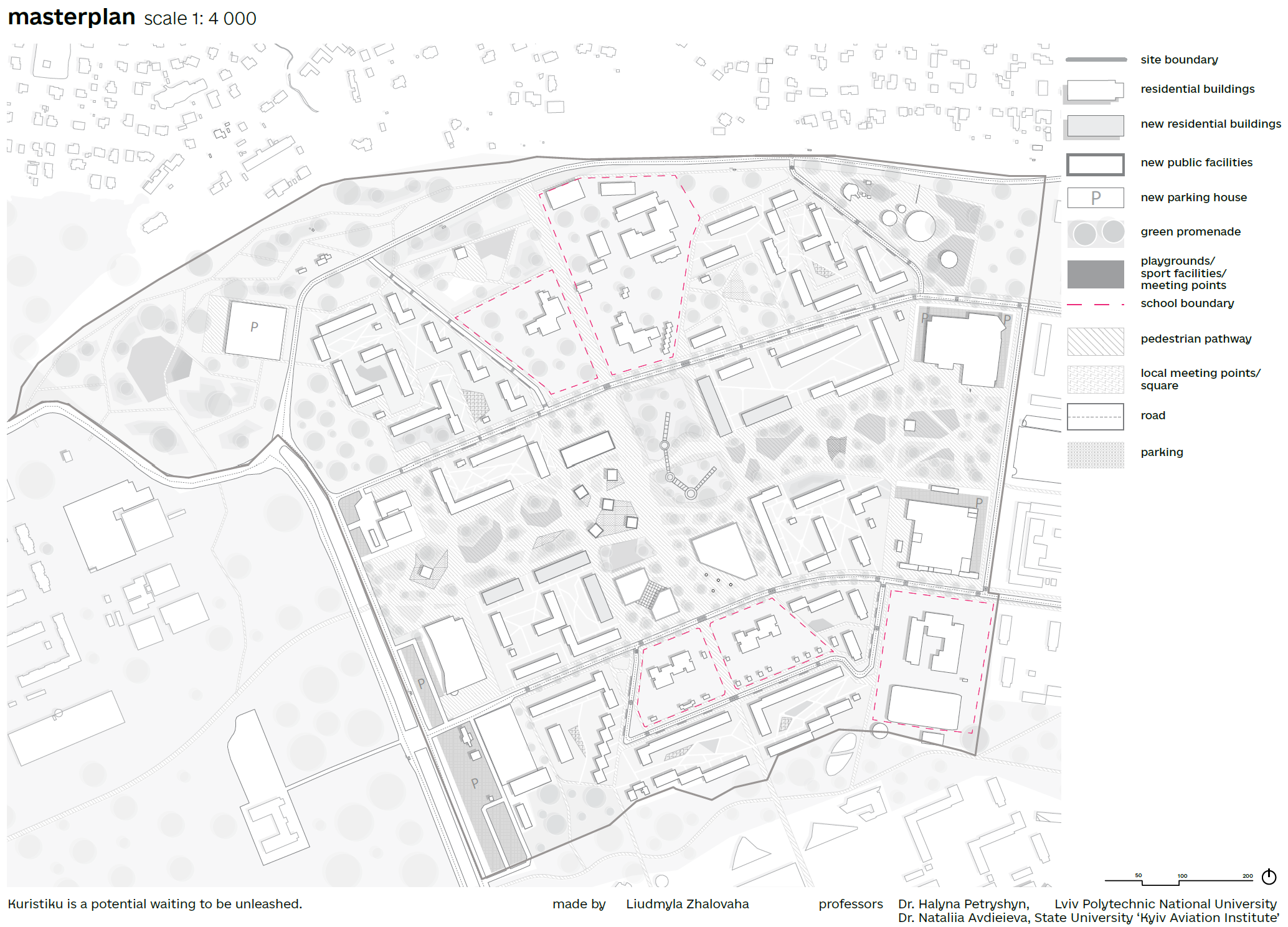 Kuristiku Garden is a regeneration project that repositions a Soviet-era microdistrict as a people-oriented, landscape-driven urban system. Its central goal is to transform car-dominated open space into a coherent framework where green infrastructure, public life, and sustainable mobility reinforce one another. The project establishes a clear spatial identity by prioritizing continuous green networks, active public spaces, and integrated mobility over fragmented lawns and surface parking. By aligning ecological corridors with pedestrian movement and future public transport, Kuristiku Garden reconnects the district both internally and to the wider city. Ultimately, the project aims to demonstrate how post-socialist residential areas can evolve into resilient, inclusive, and climate-responsive urban environments, shifting the focus from isolated housing estates to connected, living neighborhoods embedded within Tallinn’s metropolitan structure.