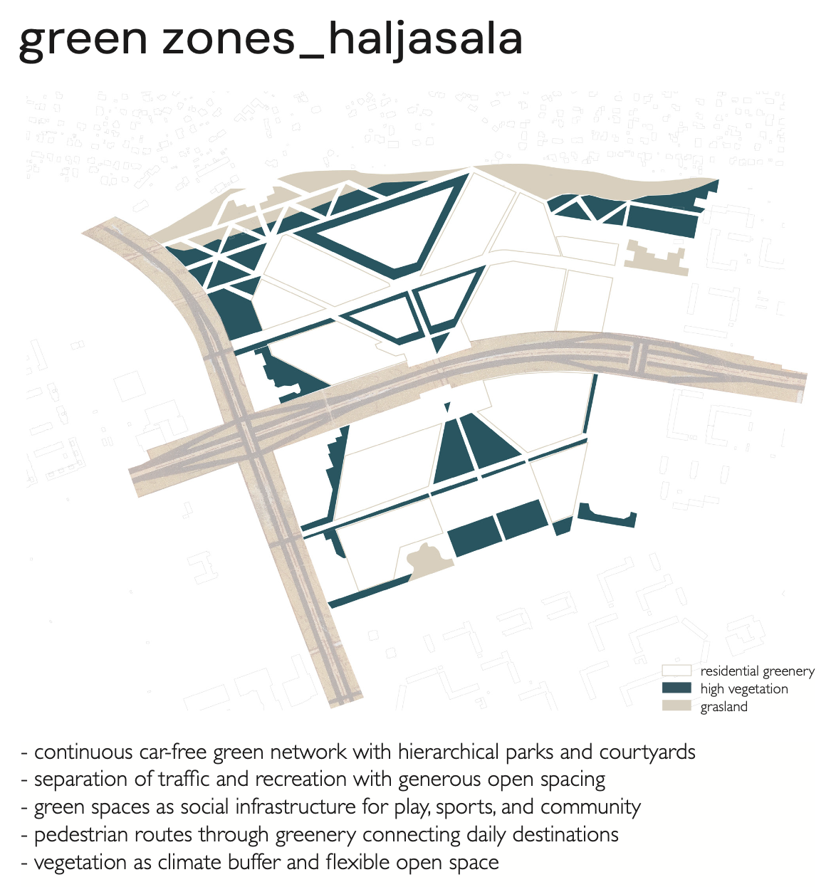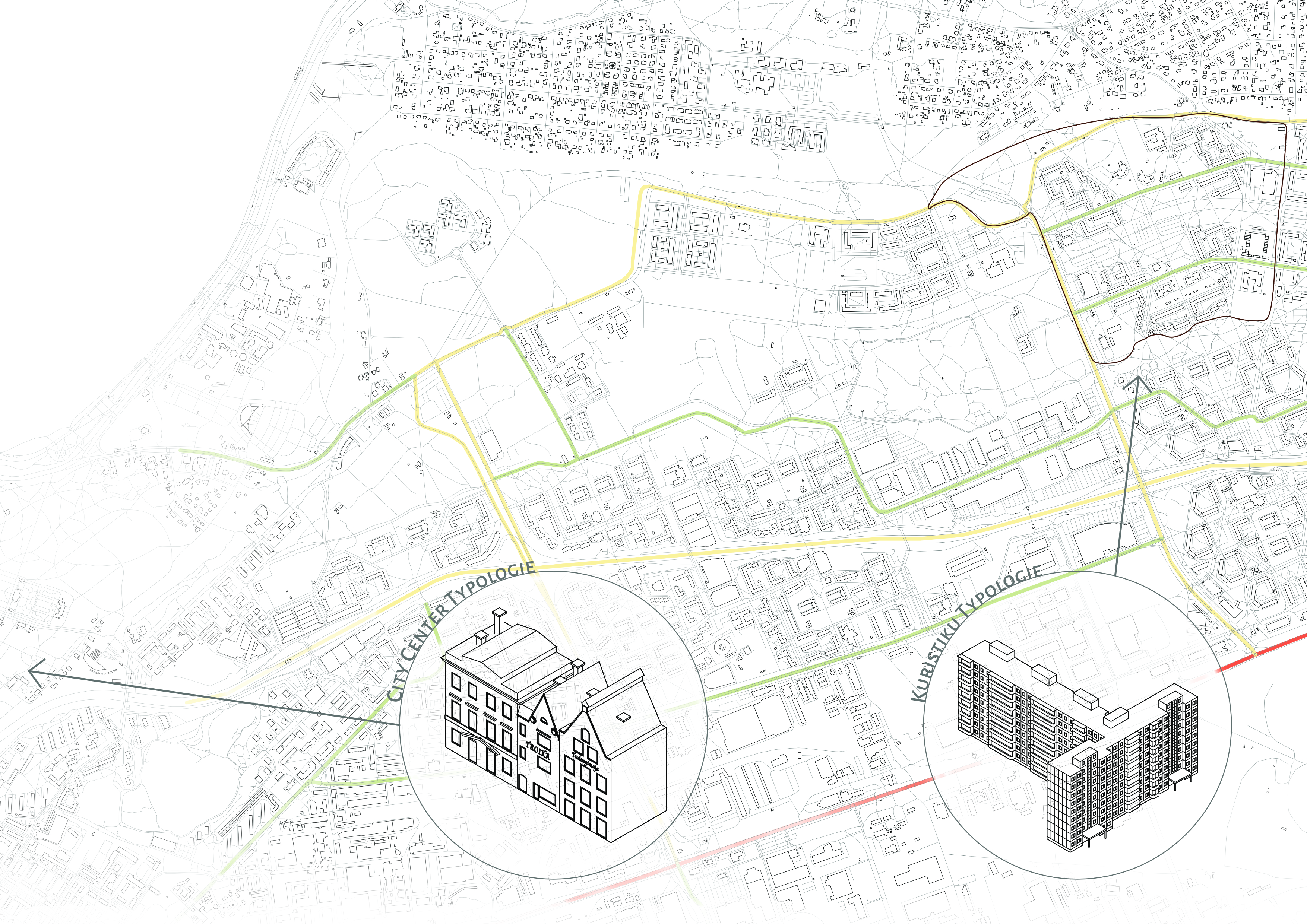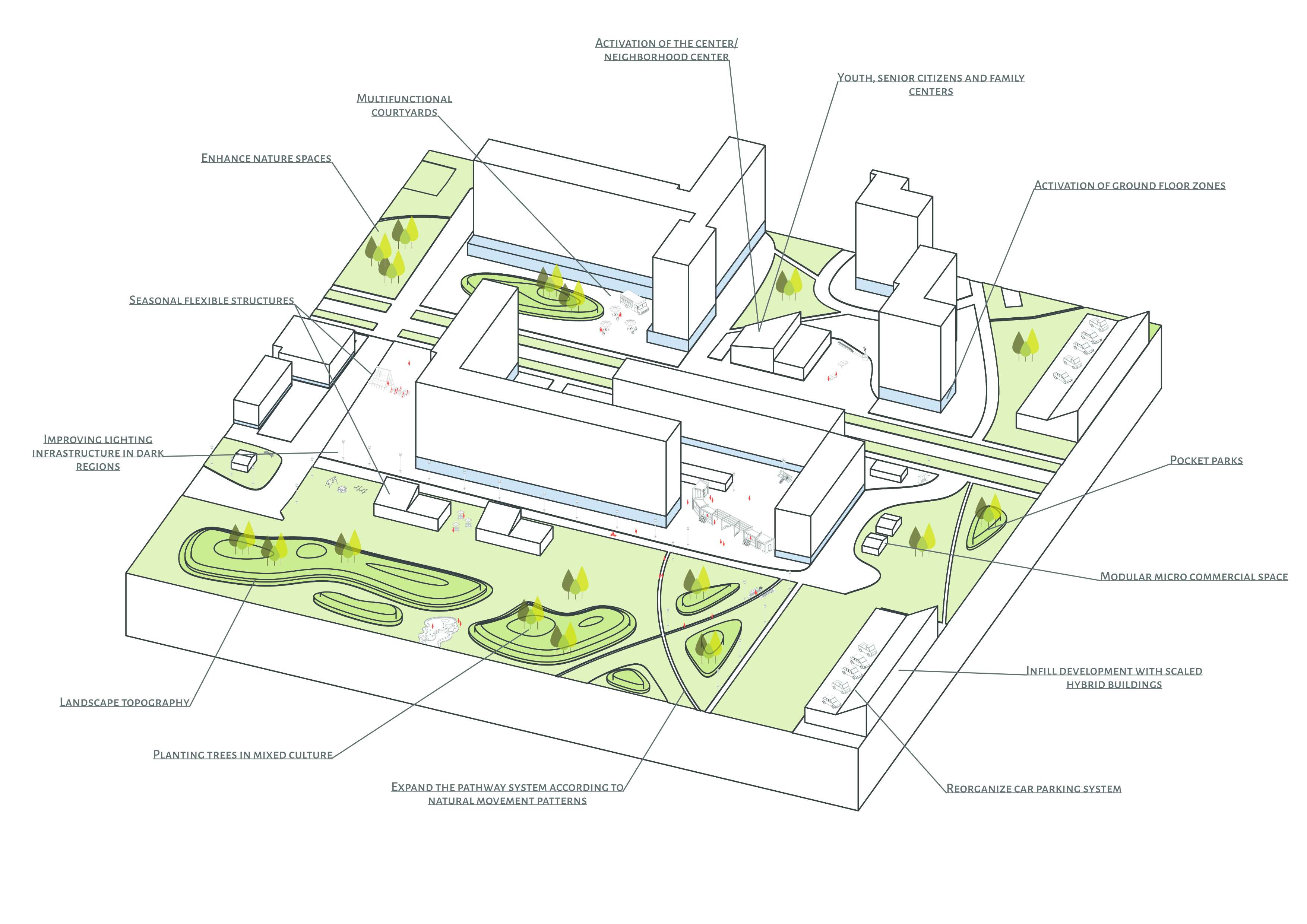 The concept focuses on the re-scaling of Kuristiku as a strategy to enhance urban resilience. By introducing scale transitions from the district level to the neighborhood level and down to the human scale, we aim to create environments that are more legible, flexible, and adaptable over time. Breaking up monolithic land-use patterns and introducing mixed-use functions increase programmatic diversity and economic robustness, while age-inclusive and year-round public spaces strengthen social resilience. In addition, the project emphasizes the activation of ground floors, improved pedestrian and cycling networks, and the clear definition and programming of open spaces. Strengthening existing green structures and integrating ecological functions support environmental resilience and improve microclimatic conditions. Together, these spatial strategies form a coherent framework for transforming Kuristiku into a more human-centered, socially diverse, and resilient urban district.