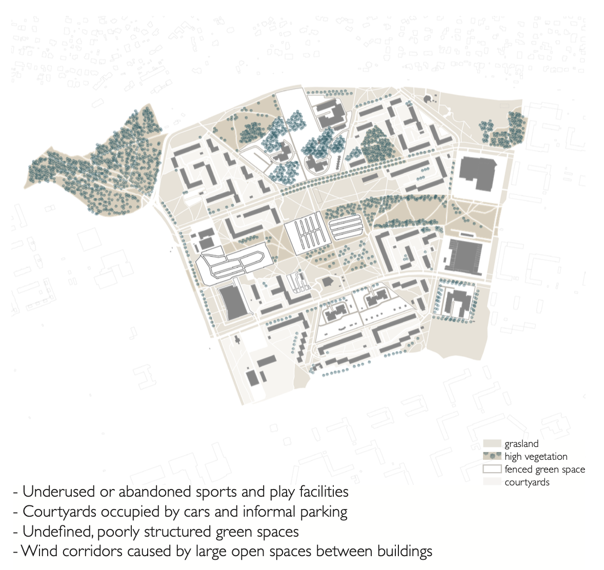 “Unfolding the Microrayon Vision” critically revisits the Soviet microrayon concept and master plan as applied to Lasnamäe in Tallinn, Estonia. Our analysis is structured around the original Soviet vision, the current condition, and the resulting goals and initial design concepts. Central to the investigation are the anonymity of the housing blocks and the lack of orientation caused by a mono-functional planning logic, which have led to a lack of addressability and identity. Our aim is to transform anonymous blocks into recognizable neighborhoods. Additionally, the original car-free interior concept has been undermined over time, as vehicles have occupied open spaces in the absence of a clear parking strategy. Our concept proposes assigning distinct identities to individual blocks through varied programs, densities, and spatial qualities.