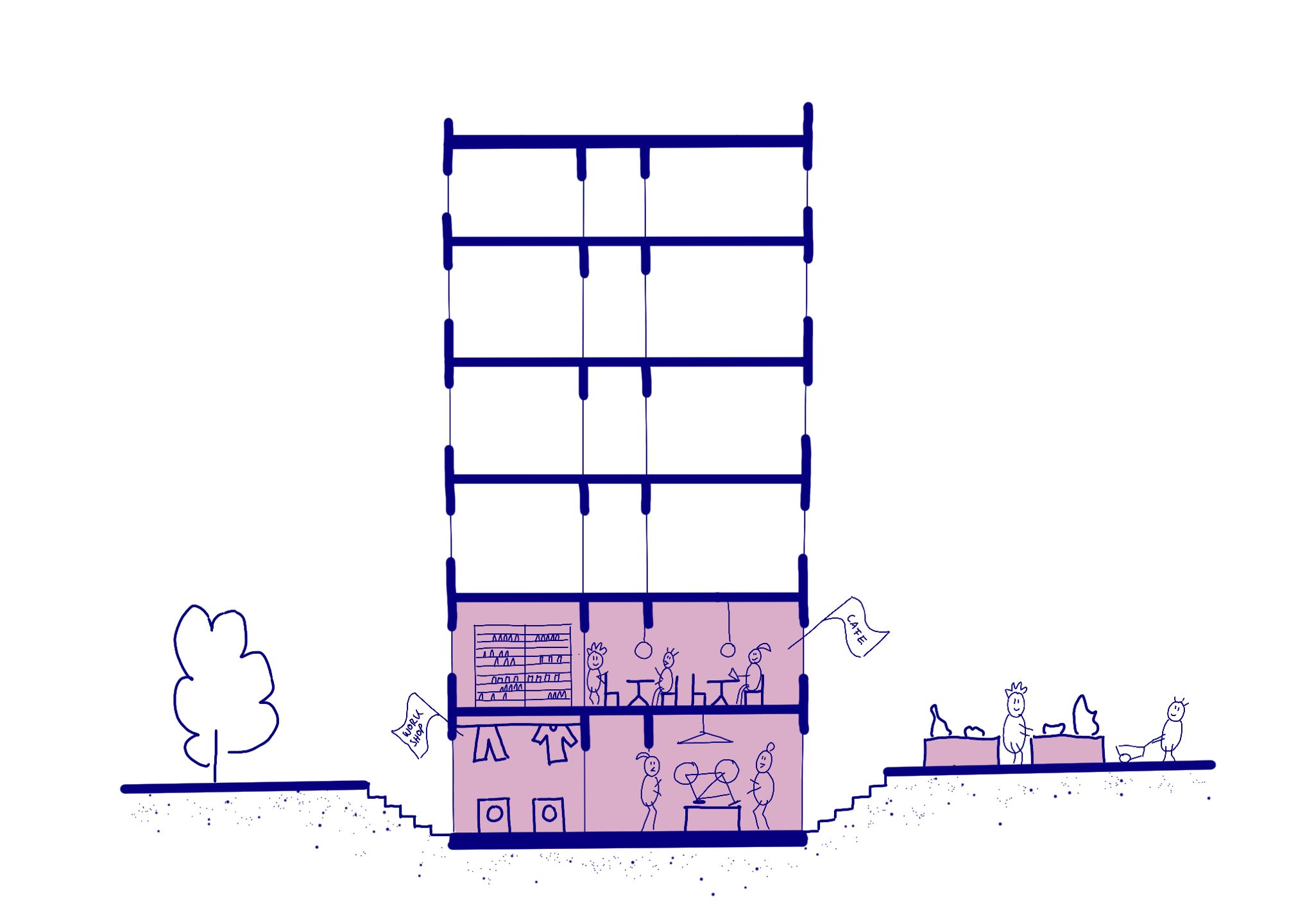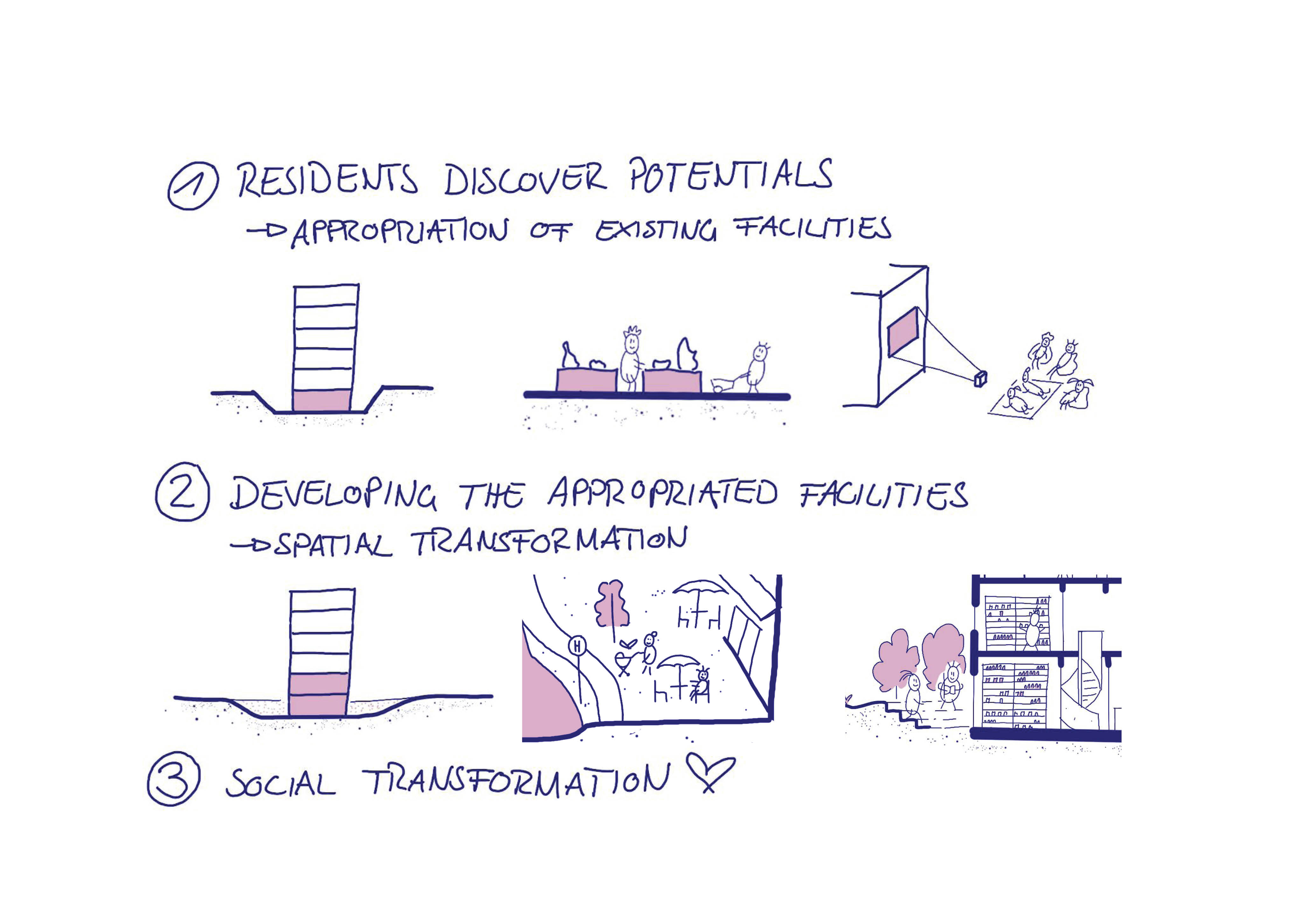 Each of these interventions will be addressed on different scales of Kuristiku, starting with our smallest scale, the inhabitants of the buildings, whose cooperation and cohesion must be supported with financial strategies and meeting places. This enables them to maintain the building fabric and the surroundings.