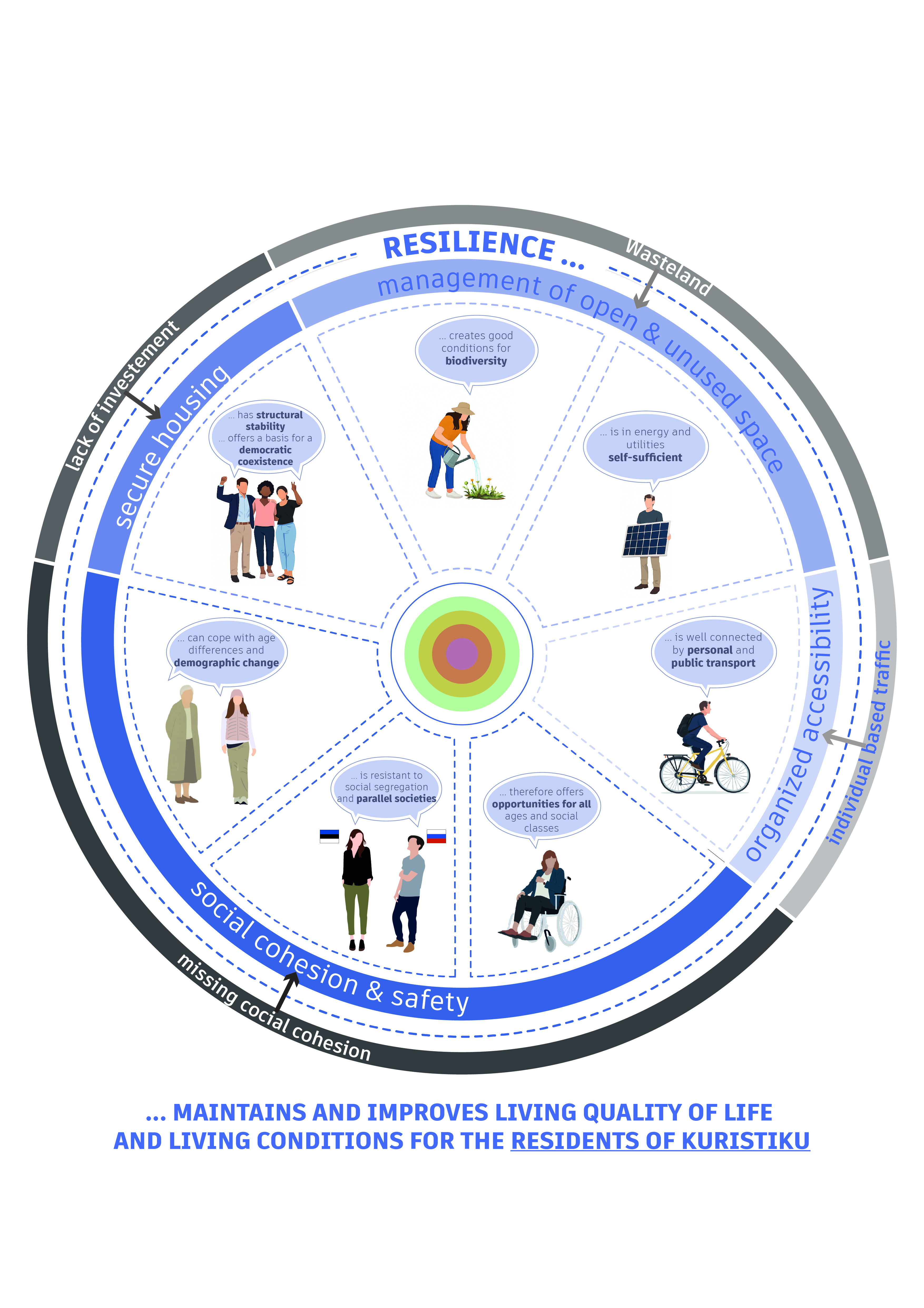 KurisCO-Lab defines resilience as the ability of the district to strengthen social cohesion, ecological diversity, and adaptive mobility while respecting existing structures. Our goal is to transform barriers into connectors, revive underused green spaces, and enhance pedestrian networks within and beyond Kuristiku. By unsealing surfaces and extending existing paths, we aim to promote safe, confident walking and improve connections to neighboring districts and the inner city. These goals are pursued through resident appropriation and small-scale interventions. Resilience here is not achieved through large, disruptive projects, but through incremental changes that gently reshape space, empower residents, and reinforce local identity. Residents are not passive users but active participants in shaping their environment. KurisCO-Lab envisions a resilient Kuristiku that evolves with its community, ecology, and everyday life.
